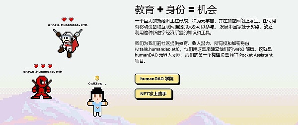 HumanDAO:HumanDAO 旨在利用加密貨幣來幫助滿足全球近 20 億可以訪問互聯網但日收入低于 20 美元的人的需求。HumanDAO 提供了兩種途徑,使他們的目標受眾社區能夠獲得更多的收入。一種是 Learn2Earn (邊學邊賺),一種是 Play2Earn (邊玩邊賺)。