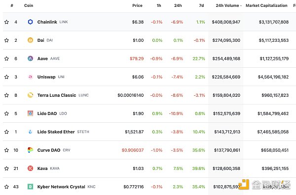 DeFi總市值及前十代幣 數據來源:coingecko