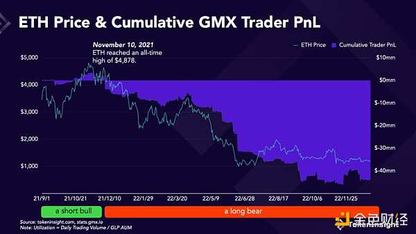 GMX 15 個月的歷史可以分為兩個部分。第一階段從 2021 年 9 月 1 日到 2021 年 11 月 10 日,是一個短暫的牛市,ETH 沖到了歷史高點。從 2021 年 11 月 10 日起的第二階段,是漫長而痛苦的熊市,ETH 下跌了 70% 以上。