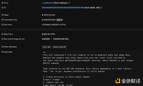 考慮另一個主要的改進建議:EIP-4444。該EIP可能會在未來一兩年內實施。這個提議的想法非常簡單:以太坊節點將不再需要保留超過一年的交易歷史記錄。這將包括塊頭、調用數據等。這可能會影響使用歷史數據的應用程序,例如市場分析或經濟研究。它還會影響一些 NFT 項目。例如,一些著名的 NFT 項目將其代碼或數據存儲在調用數據中。你也可以在Etherscan上看到這一點。這是生成0xDEAFBEEF原型項目之一 Synth Poems 的 C 代碼。它位于用于此事務的調用數據中(其哈希值可從此處的合約函數中恢復):