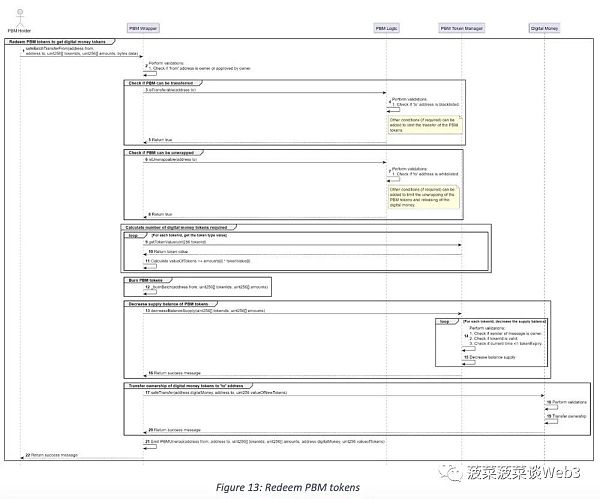 ? 步驟13至16:減少PBM代幣的數量。在我們的設計中,代幣的到期日期的驗證是在第14步進行的,而不是在第7步。這是因為代幣管理器被設計為管理所有關于PBM代幣的方面,根據我們的設計。其他人可能會在第7步實施驗證。
