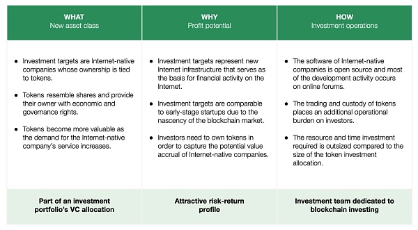 加密領域資產類別的復雜性,監管問題和迅速發展,都使得加密領域投資適合一個長期和積極的投資策略。區塊鏈技術在許多方面更類似于互聯網,它屬于一種對不同行業而不是對單一垂直領域有影響的技術,這就是為什么一個成功的投資運營往往需要一個專門團隊。