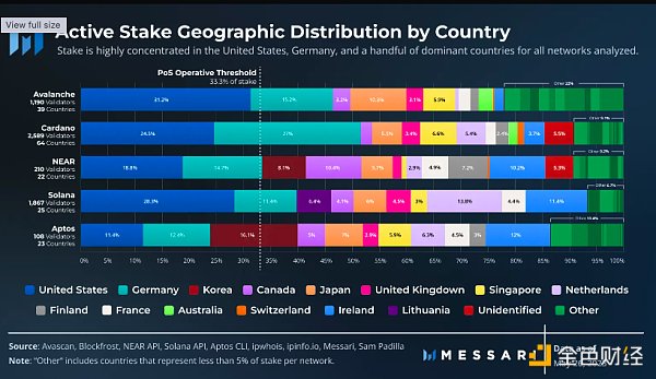 就國家而言,美國和德國是所有網絡中擁有最多驗證者和質押的地理位置。美國是驗證者托管最多的國家,Avalanche、Cardano 和 Solana 的驗證者數量最多。NEAR 和 Aptos 在德國托管的驗證者略多。