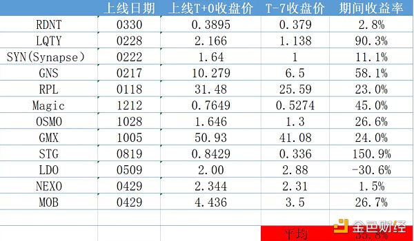 可以看出,Binance 的[上幣效應]非常明顯,除 LDO 外,Binance 的剩下 13 個新幣均出現了明顯漲幅,平均上漲 35.8%。(LDO 上線期間 BTC 價格出現了 39K-29K 的下跌),35.8% 即使扣除-22.3% 的上線至今收益率,仍可以取得 13.5% 的收益率。