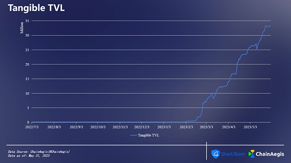 Tangible上線后一直表現平平,直至今年2月3日,其TVL開始持續增長。截止到5月31日,達3331.68萬美元,相較于2月上漲了370.95倍。
