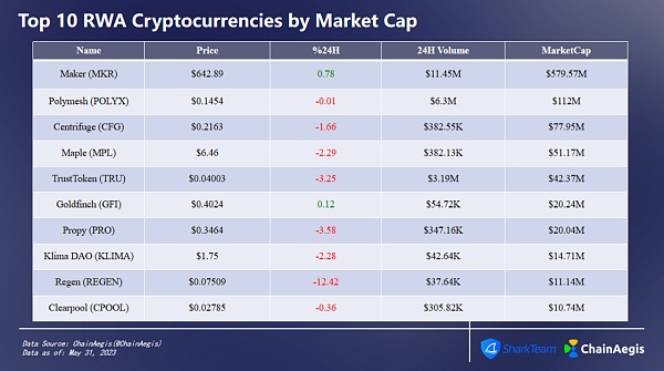 Maker DAO發行的$MKR是目前最大RWA代幣,24小時交易量為11.45M;受監管的機構級Layer1區塊鏈Polymesh發行的$POLYX排名第二,24小時交易量為6.3M。排名第三為信貸協議Centrifuge發行的$CFE,24小時交易量為382.55K。