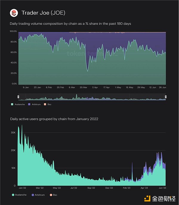 通過擴展到 Arbitrum,Trader Joe 捕獲了進行較大交易的用戶。40% 的 Trader Joe 交易量和 25% 的活躍用戶來自于 Arbitrum 上的活動。每個用戶的增加交易量表明,在 Arbitrum 上,Trader Joe 能夠吸引平均交易規模更大的交易者,優于在 Avalanche C-Chain 上。