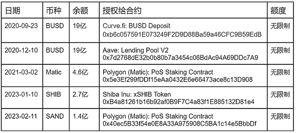這時我們會發現一個奇怪的現象,就是這個地址上有的幣種限制了授權額度,有的幣種卻直接無限制,授權額度規則看起來并不統一。我們特別關注到 BUSD、Matic、SHIB、SAND 這幾個余額較大的幣種,地址余額分別為 19 億美金、4.6 億美金、2.6 億美金、1.4 億美金,相關授權記錄如下: