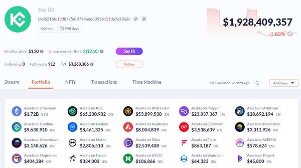 這是 Kucoin 交易所的地址,其 ETH 鏈上有17億美金,其他鏈加起來19億美金。此地址資產截圖如下: