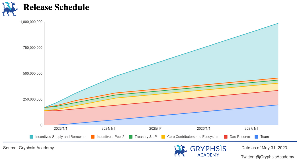 RDNT代幣的總供應量為10億,分配給Incentives, 團隊, reserves, contributors, treasury & LP,以及流動性提供者。所有代幣將在2027年7月前完全解鎖。