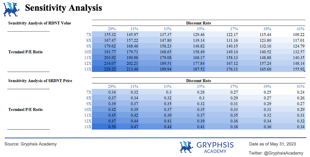 我們分別分配給低和高情景25%的概率,中等情景分配了50%的概率。經計算,RDNT價格的概率加權DCF估值為0.37美元,協議的估值為1.6814億美元。2023年5月31日的RDNT價格為0.31美元,有17.26%的潛在上漲空間。