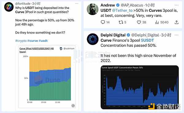 而在過去最近 48 小時里,Curve 3pool 中的 USDT 集中度上升至了 50%,又在僅僅一個小時內又從 50% 急劇上升到了 74%。這引發了社區的擔憂,大家似乎都對 USDT 突如其來的拋壓有些摸不著頭腦。難道是有人提前知道了一些關鍵信息?畢竟上一次 Curve 3pool 中的 USDT 集中度超過 50%,是在 2022 年 11 月 FTX 崩盤之時,自那之后 USDT 集中度就再未達到如此高的程度了。