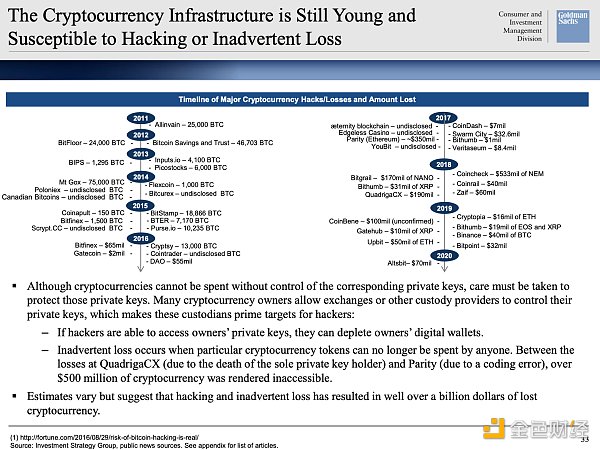 在資料中,高盛還盤點了近10年大額的黑客盜幣事件,例如2014年的門頭溝,2018年的幣安、Bithumb,2019年的Upbit等。