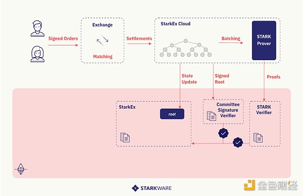 鏈下部分:交易所將交易發送給StarkEx Cloud,StarkEx Cloud將對其進行驗證,并相應地更新鏈下狀態。當積累了足夠的交易或經過了足夠長的時間后,交易所將對交易進行批處理并創建其有效性的證明。該證明與新的狀態一起發送到鏈上。