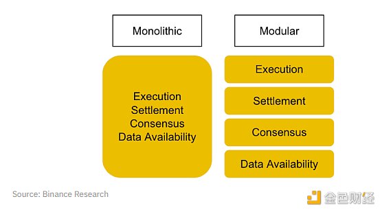 區塊鏈致力于執行四個關鍵功能:共識、數據可用性、執行和結算。盡管整體化區塊鏈在同一層級上以通用的方式執行所有這些功能,但模塊化區塊鏈旨在將它們分離到不同的鏈和協議中。