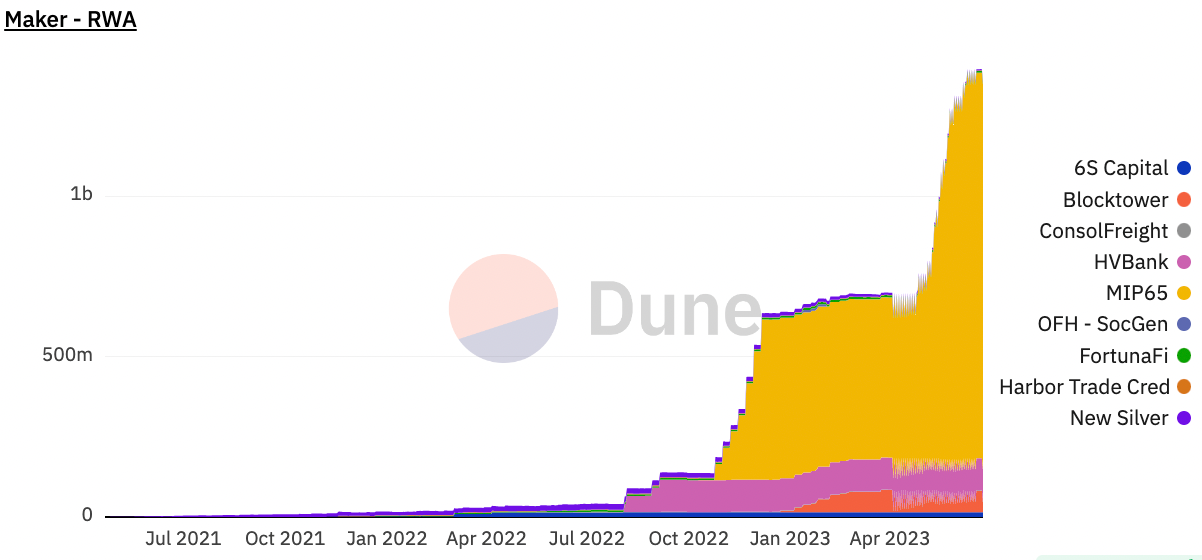 截至2023年6月24日,根據dune數據,MakerDAO RWA業務規模將近14億美元,占MakerDAO資產負債表41%,帶來530萬美元收入,占協議年化收入的52.2%。