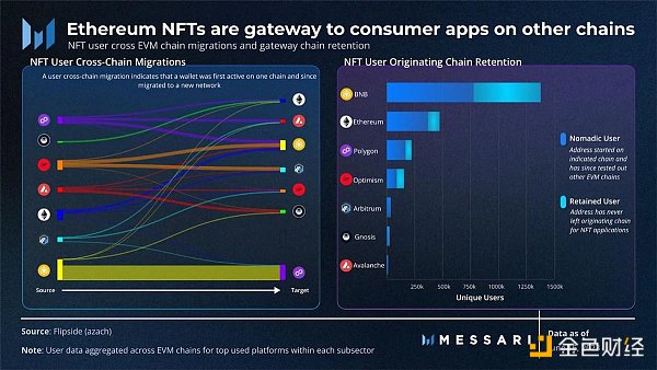 為了提供無縫的用戶體驗,除了傳統的 NFT 市場之外的消費應用程序需要高吞吐量和低 GAS 費用。針對這種需求,許多這些應用程序已經尋求 Layer-2 擴展解決方案和側鏈。這種轉變促使基于以太坊的 PFP 交易者探索新的鏈路,大約 80% 的用戶在不同的網絡之間表現出“游牧”行為。