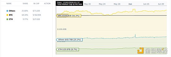 此外,相比于減半時BTC(66.2%)、ETH(8.7%)、其他(25.2%),時隔30天,BTC(64.34%)、ETH(9.77%)、其他(25.88%)。比特幣市值占比略有下降,以太坊市值占比上升,其他加密貨幣略有提升。總體而言,加密貨幣市場中占比排名第一的是比特幣,以太坊排名第二,其他幣種基本維持平穩。