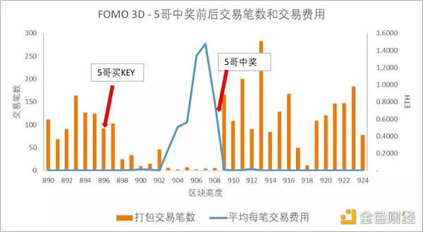 并沒有過多久,天才就出現了:他用大概 2.7 ETH 的成本拿下了 10, 469 個 ETH。從瀏覽器上看,他似乎只是平常的在每次倒計時剩 3 分鐘的時候用智能合約腳本買一個 Key。但他還做了一件牛逼的事情——他想辦法堵塞了以太坊,讓礦工在他購買之后不會打包別人的購買 Key 的交易。在他中獎的 3 分鐘、 12 個區塊里,以太坊被 5 哥(復盤的人給黑客起的綽號)發起的許多筆極高 Gas 的交易給填滿了——沒有礦工有功夫給下一個買 Key 的人打包。他成功了。