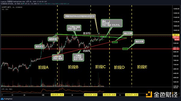 自6月2日BTC假突破10000之后,目前BTC走勢形態已經開始符合威科夫操盤的派發頂部形態。目前BTC價格為9800,屬于假突破之后測試9850一線頂部壓力的區間,如果BTC不能依靠現貨力量有效突破[9850,10000]重回10000,那么這里將構建一個非常大的頂部派發,那么接下來BTC下行主要目標位有且只有兩個9100與8600。如果BTC能日線級別能有突破站回10000,那么新的的多頭趨勢開始了。