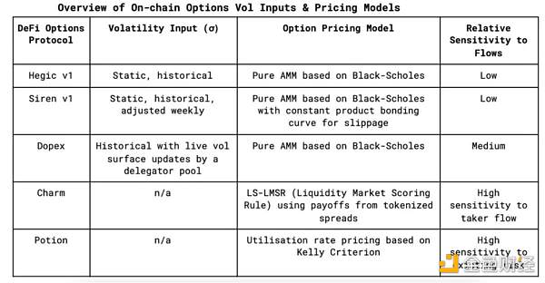定價最常見方法是使用 Black-Scholes 公式,該公式考慮了資產價格、執行價格、無風險利率、到期時間和隱含波動率。在這五個因素中,唯一不可觀察的因素是隱含波動率(IV),它是反映市場對特定證券未來波動性預期的指標。傳統上,可以通過期權合約的供求來計算 IV:需求高、供應低導致 IV 高,反之亦然。然而,由于需求和供應的流動不一致,IV 對于鏈上期權協議來說是困難的。例如,在 Hegic 中,其 IV 是在鏈下計算的,并每周手動更新到鏈上。這意味著無論您開設 100 美元還是 10000 美元的平值期權,其定價都將相同。這一點很重要,因為與基于 CLOB 的系統中的做市商可以根據有關真實價格的新信息動態重新定價報價不同,AMM LP 僅依賴于嵌入在智能合約中的定價函數。因此,在市場波動時,LP 可能面臨高額的無常損失,其中 IV 可能顯著低于實現波動率。如下圖所示,大多數第一代期權 AMM 具有靜態波動率輸入,不會根據實時交易量動態調整。