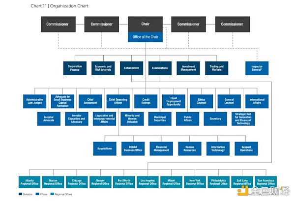首先我們來看一下SEC的架構,最上面是包括主席+4名委員構成的委員會,下設6個部門+1個監察長辦公室+11個辦公室。除此以外,還有11個分地區的辦公室。需要注意的是,這11個地區辦公室需要同時向執法司(Enforcement)和檢查司(Examinations)匯報。