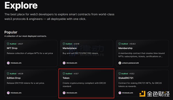 接著我們可以選擇要部署的合約類型。這里可供選擇的類型很多,無代碼一鍵部署 ERC-20、ERC-721、ERC-1155 Token 都是支持的,甚至支持部署一個帶質押功能的 ERC-721 Token、可租借的 NFT ERC-4907 乃至像 OpenSea 那樣的交易市場等等。這里我只是簡單的部署一個 ERC-20 Token,所以選擇「Token」: