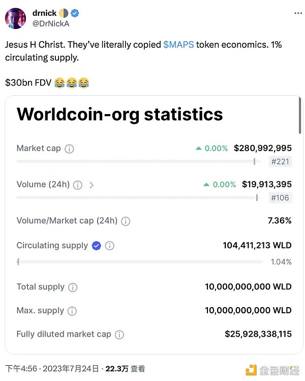 關于 WLD 擁有極低的代幣流通,和極高的代幣全流通市值這一情況,很多用戶表示,這與 Solana 上因 SBF 而臭名昭著的「Sam coins」Serum、Oxygen、MAPS 如出一轍。