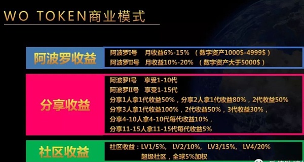 平臺經營模式:平臺要求新會員繳納價值1000美元以上的數字貨幣即可開啟“阿波羅智能機器人”,獲得6%-20%的高額靜態收益,而會員間按照層級關系發展人數等可獲得分享收益、社區收益等。