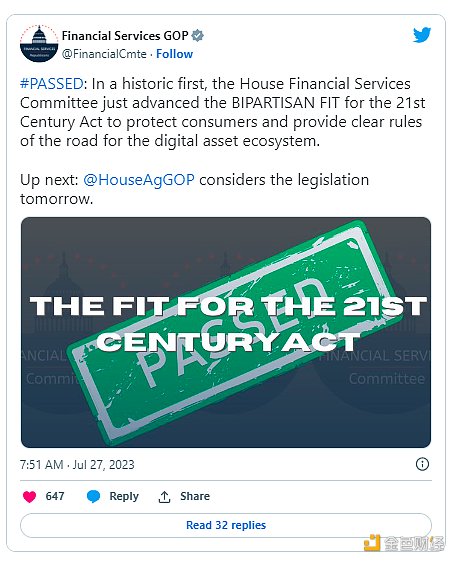 金色財經注:推文內容:眾議院金融服務委員會剛剛提出了《21 世紀法案》,這是歷史性的首次,旨在保護消費者并為數字資產生態系統提供明確的規則。
