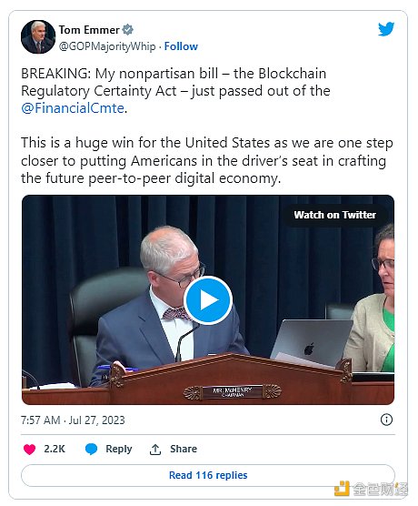 金色財經注:推文內容:我的無黨派法案——區塊鏈監管確定性法案——剛剛從@FinancialCmte 通過。這對美國來說是一個巨大的勝利,因為我們距離讓美國人在打造未來點對點數字經濟方面處于主導地位又近了一步。