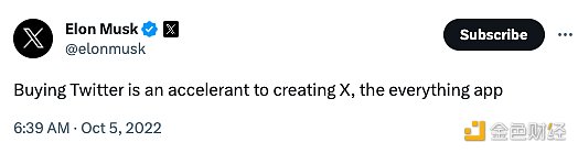 在2022年收購Twitter時,馬斯克曾表示,“收購Twitter是創建X這個一切應用程序(Everything app)的加速器”。