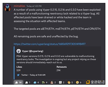 EVM編譯器Vyper發現了一個零日漏洞,DeFi面臨著一連串的安全風險,資金池耗盡,清算威脅迫在眉睫!