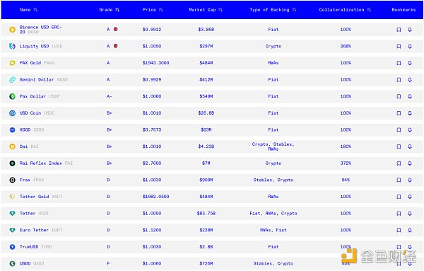 有趣的是,其他 DeFi 穩定幣也在評估范圍內,DAI 和 RAI 獲得 B+ ,USDD 則被評為 F。