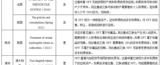 除以上明確對NFT有征稅或者計劃征稅的國家和地區之外,大部分國家對NFT沒有明確的稅收處理方式。一般來說,如果某個國家或地區頒布了加密貨幣/加密資產的稅收規則,且沒有頒布針對NFT的專門規則;可以合理推知NFT遵循與加密貨幣相同的稅收原則,即:加密貨幣往往被視為資本利得稅下的應稅資產。如果投資者出售、交換或贈送NFT,則可能需要繳納資本利得稅或者產生資本損失。如果投資者通過挖礦、質押或其他方式獲得NFT,也可能需要繳納所得稅。