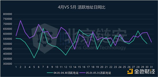 再看看活躍地址數,也就是主動發起轉賬的地址數,2020 年 5 月活躍地址數為 17917062 個,比 2020 年 4 月的 15649819 個增長了 14.49%。
