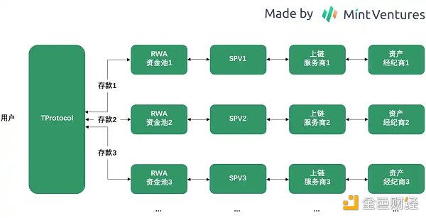 以下圖為例,SPV 的發起方,可以是不同的機構,后續的上鏈服務商、資產經紀商也可以不同。TProtocol 的業務機構更加靈活,但這并非沒有成本:隨著合作方越來越多,SPV 后續的管控,包括對于服務商的檢查和管理能力可能也會在一定程度上降低。