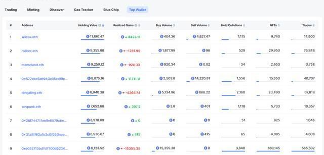 Top1錢包wilcox.eth該錢包地址持有NFTs9,740個,持有資產11285.6078ETH,主要在Ethereum、BSC、Polygon、Aribtrum上活躍,其持有的頂級NFT資產包括CryptoPunks、Meebits。