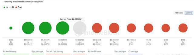 下圖顯示ADA將在0.40美元處面臨輕微阻力。在這個區域,擁有46.7億個硬幣的263,000個地址的集群可能決定預定一些利潤。如果ADA突破該區域,則可能反彈至0.44美元。然而,持有26.3億枚硬幣的382,000個地址的相當大的阻力可能會成為障礙。