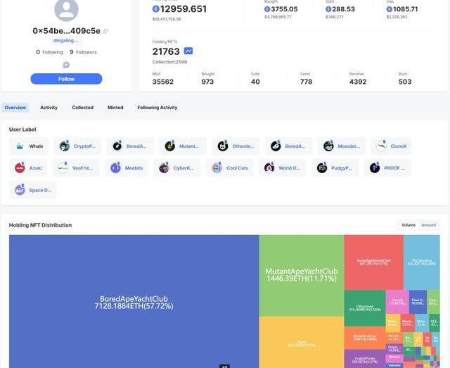 巨鯨dingaling.eth該地址目前所持有的BAYC有102個,占所持有NFT現總估計價值的比例高達57.44%,并且從圖中不難看出,該地址在BAYC上預估目前可盈利最多,高達7128ETH,BAYC衍生產品MYAC占所持有NFT比例11.71%,價值1446.39ETH。值得注意的是,在目前的集合中,從TopHolders可以看出,就BAYC項目該地址Receive127個,send25個。