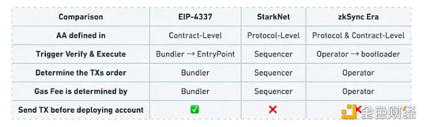 執行 AA 機制的角色是:在 zkSync 時代中開啟與其他兩者 AA 的差別在于 Operator 需要和 bootloader(系統合約)一起配合,例如 bootloader 會開啟一個新區塊并定義該區塊的相關參數,接收操作員發送來的交易者并進行驗證。在 4337 中這部分由 Bundler 與 EntryPoint 協作,而在 StarkNet 中這部分全部由 Sequencer 負責。