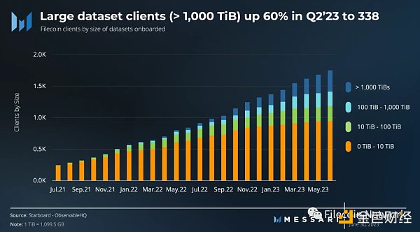 近乎于 0 的存儲費用可能進一步鼓勵了用戶通過 Filecoin 存儲交易提議處理的數據。2023 年二季度,通過活躍交易在 Filecoin 網絡上存儲了近 954 PiB 的數據,環比增長 64% 。