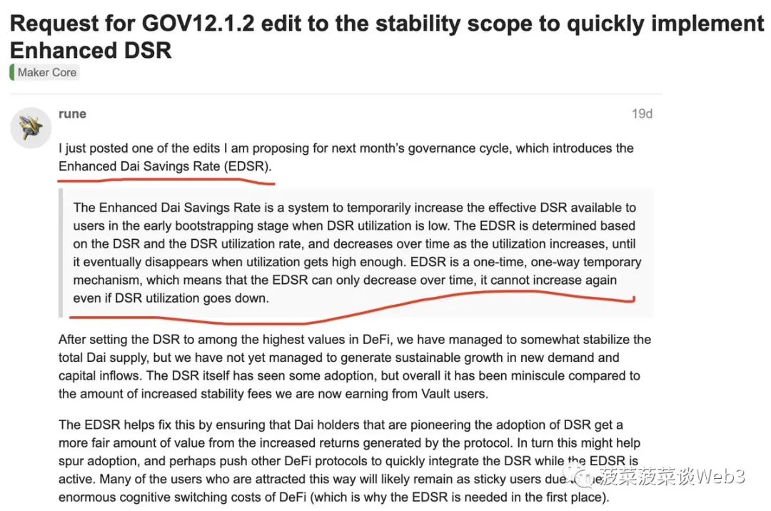 先說答案,不可持續,因為這次的8%利率其實是一個一次性的“促銷活動”,我們可以看到在討論提高DSR利率的討論中Rune說到引入了一種新的機制:Enhanced Dai Savings Rate (EDSR),這是一種用于在DSR利用率較低的早期引導階段臨時提高用戶可使用的有效DSR。