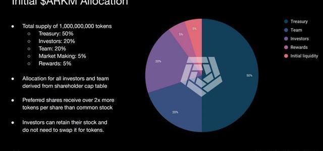 ARKM代幣是ArkhamIntelExchange生態系統的原生代幣,同時也是首個加密情報代幣。該代幣的空投已于7月8日進行了快照,女巫攻擊者和試圖操縱系統的賬戶已被標記并且無法申領空投。空投將于7月18日上線,只有通過Arkham官網輸入地址才能領取。根據官方數據,ARKM代幣的總發行量為10億枚,其分配如下:國庫50%、投資者20%、團隊20%、做市5%、獎勵5%。