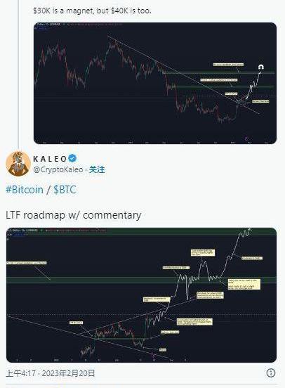 上周,Kaleo在推特上表示,雖然3萬美元無疑是一塊“磁鐵”,但4萬美元也是一塊磁鐵。這位分析師預測,在2023年4月至2023年7月期間,比特幣可能會達到4萬美元的高點和3萬美元的低點,其563,900名推特粉絲。