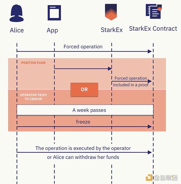 相比之下,有逃生艙Escape Hetch機制的StarkEx方案要有過之無不及。如果L2用戶在L1提交的Forced Withdrawal請求在7天窗口期結束時,未得到定序器響應,則該用戶可以調用freeze Request功能讓L2進入凍結期。此時,L2定序器將無法在L1上更新L2的狀態,L2狀態凍結后要過1年才能解凍。