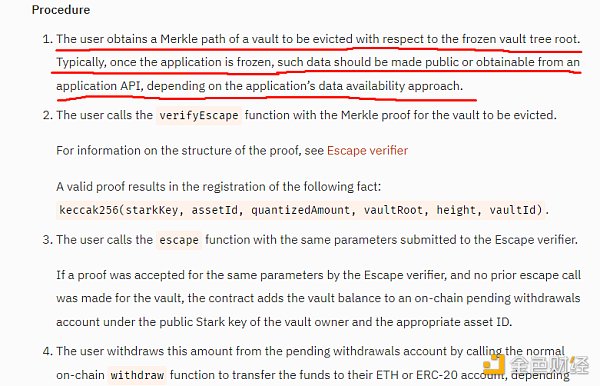 但這里存在一個問題:用StarkEx方案的L2大多是Validium(比如Immutable X和ApeX),并不會把DA所需的數據發布到ETH,構造當前L2狀態樹的信息都存在鏈下。如果用戶無法在鏈下獲取構造Merkle Proof的數據(比如鏈下DA層發動數據扣留攻擊),是無法通過逃生艙來提款的。