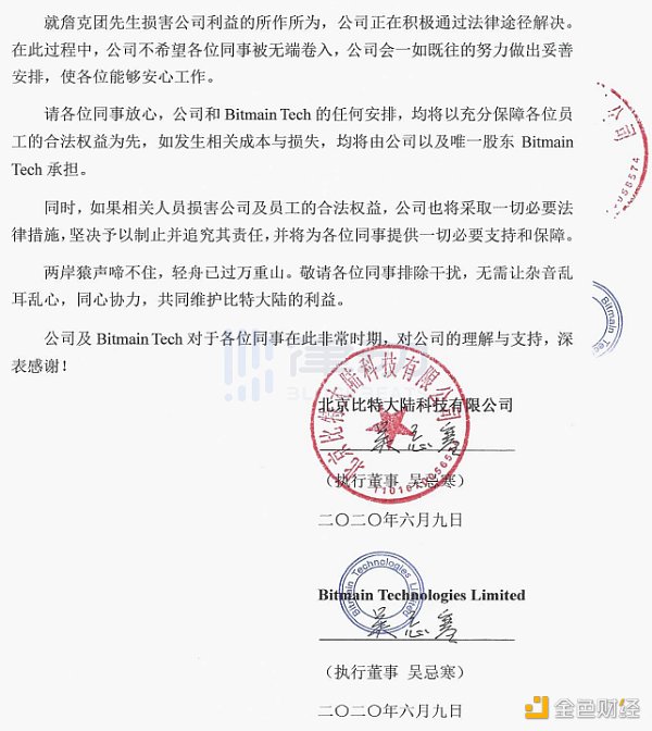 該《致全體員工書》中就目前詹克團重返比特大陸后造成的問題進行了回復,其內容指出,就詹克團先生損害公司利益的所作所為,公司正在積極通過法律途徑解決。并表示,不希望各位同事被無端卷入,公司會一如既往的努力做出妥善安排,使各位能夠安心工作。