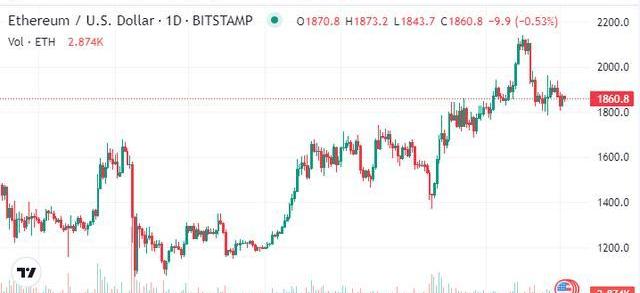 ETH/USD在前一天幾乎跌破1,800美元后,周三升至1,879.76的高點。