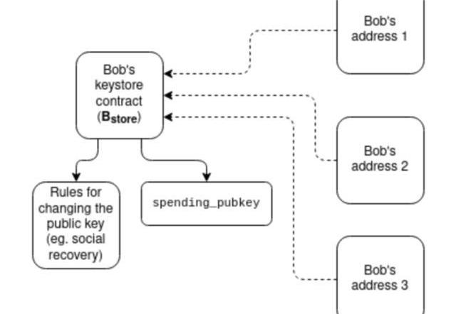 對于這些挑戰,Vitalik提出的解決方案是建立在將驗證邏輯和資產持有分離的體系結構基礎上。通過keystore合約,驗證邏輯可以放置在一個位置,與L2上不同地址相對應,從而大大降低了處理多個地址和相關安全風險的復雜性。